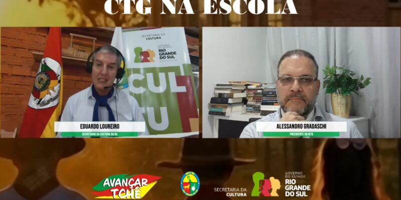 O Movimento Tradicionalista Gaúcho (MTG), a Fundação Cultural Gaúcha (FCG) e a Secretaria de Estado da Cultura (Sedac) lançaram, na noite de terça-feira (27), o programa CTG na Escola, voltado à realização de atividades culturais e formativas em escolas públicas e instituições de educação especial. O anúncio ocorreu durante uma transmissão ao vivo nas redes sociais da Sedac e do MTG, mediada por Ana Amélia Rigo, com participação do secretário de Estado da Cultura, Eduardo Loureiro, e do presidente do MTG, Alessandro Gradaschi.